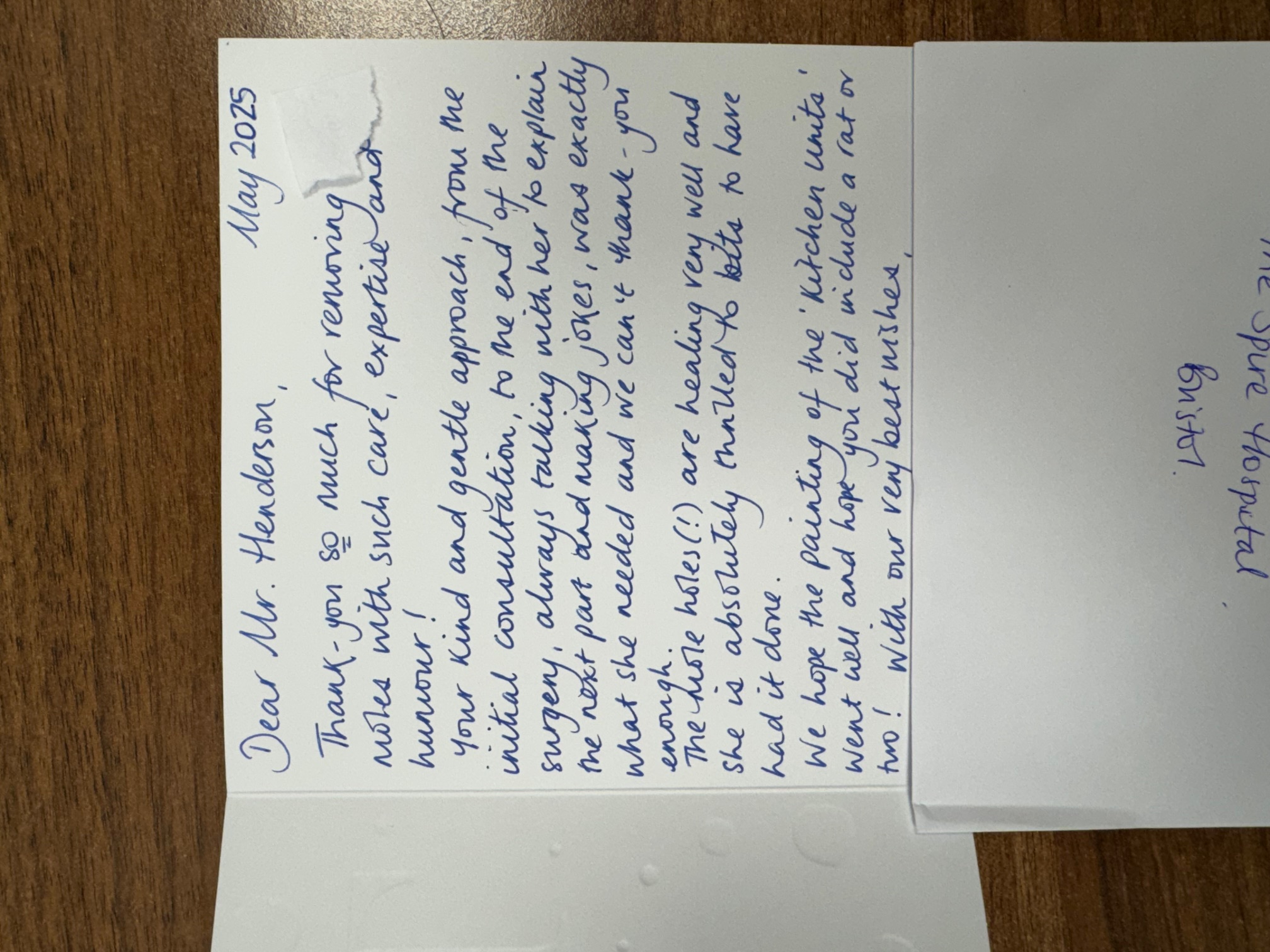 I wanted to email and see if you can pass a message on to Mr Henderson, Xxxx was so brave yesterday, I asked her on the way if she was nervous, and she said that she wasn’t as Mr Henderson was so nice and she totally trusted him, I asked her again afterwards how she had felt and she said the same again, I thought it would be nice to get the message to Mr Henderson that he made her feel completely at ease and she completely trusted him which made her less worried about the whole procedure. I think that’s a great credit to him and he should be praised for that aspect of his work as well as the brilliant job he has done removing the mole!